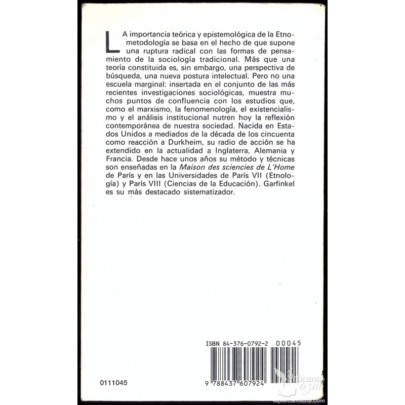 Cátedra. Madrid 1998. ISBN:84-376-0792-2. Rústica editorial ilustrada. Bien conservado. 16 líneas seguidas resaltadas con rotulador. 18 x 11 cm. 141 pp. 2ª ed. Col. Teorema. Traducción por Teodora Esteban de la obra en francés L´ethométhodologíe. Antropología. Sociología. Etnometodología.