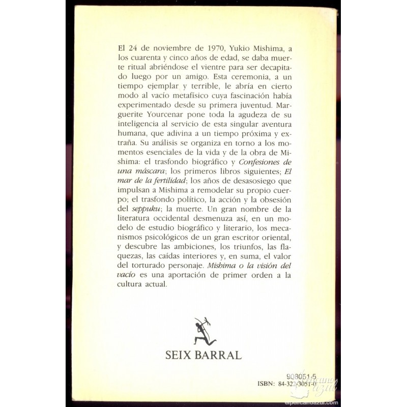 El 24 de noviembre de 1970, Yukio Mishima, a los cuarenta y cinco años de edad, se daba muerte ritual abriéndose el vientre para ser decapitado luego por un amigo. Dejaba sobre una mesa un trozo de papel que decía: "La vida humana es breve, pero quisiera vivir siempre." Esta ceremonia, a un tiempo ejemplar y terrible, le conducía en cierto modo al vacío metafísico cuya fascinación había experimentado desde su primera juventud. Marguerite Yourcenar pone toda la agudeza de su inteligencia al servicio de esta singular aventura humana, que adivina a un tiempo próxima y extraña. Su análisis se organiza en torno a los momentos esenciales de la vida y de la obra de Mishima: el trasfondo biográfico y Confesiones de una máscara; los primeros libros siguientes; El mar de la fertilidad; los años de desasosiego que impulsan a Mishima a remodelar su propio cuerpo; el trasfondo político, la acción y la obsesión del seppuku; la muerte. Un gran nombre de la literatura occidental como Marguerite Yourcenar despliega la belleza de su prosa y desmenuza, en un modelo de estudio biográfico y literario, los mecanismos psicológicos de un gran escritor oriental, y descubre las ambiciones, los triunfos, las flaquezas, las caídas interiores y, en suma, el valor del torturado personaje. Mishima o la visión del vacío es una aportación de primer orden a la cultura actual.